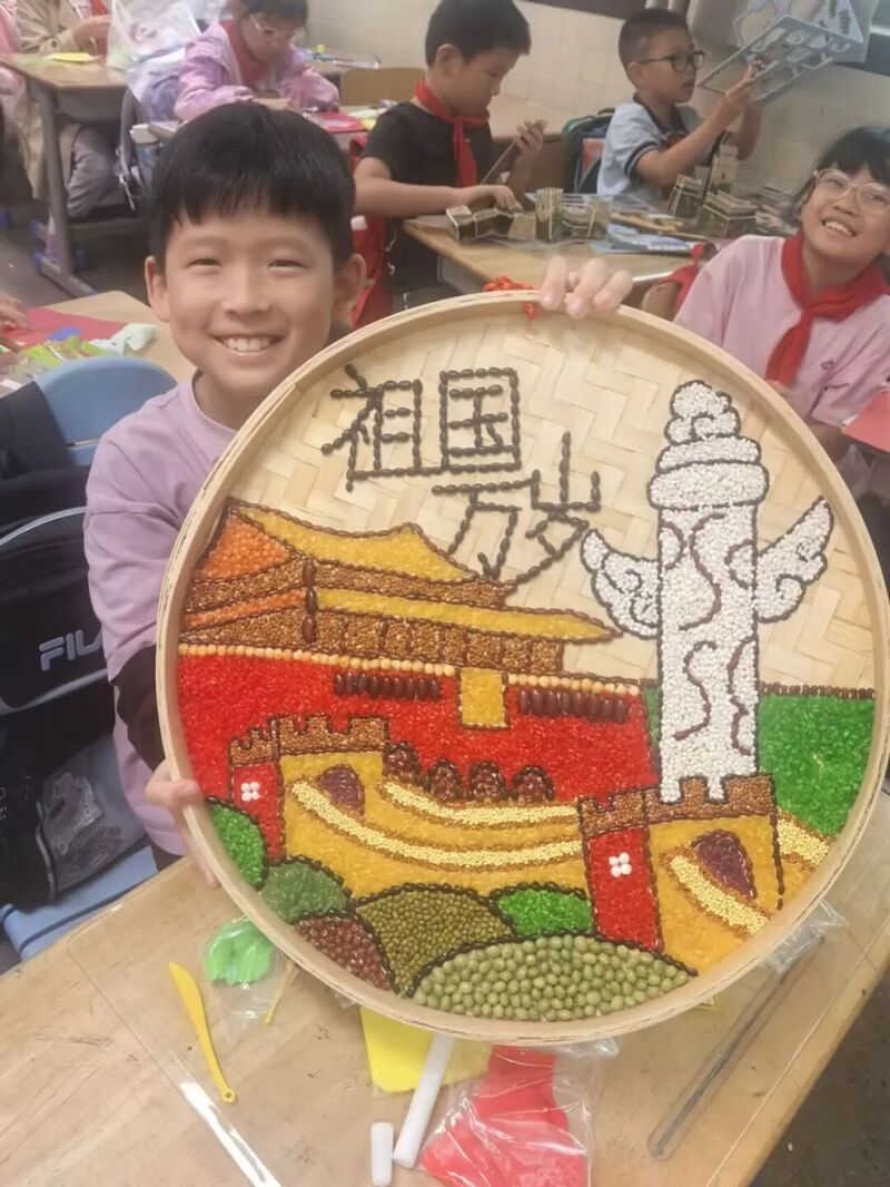 南京市瑞金北村小学低年级孩子用吸管、彩笔拼小国旗,中年级捏黏土还原“祖国山河”,高年级剪卡纸做灯笼。藏在每一件作品里的,是孩子们对祖国最纯粹、最热烈的祝福。