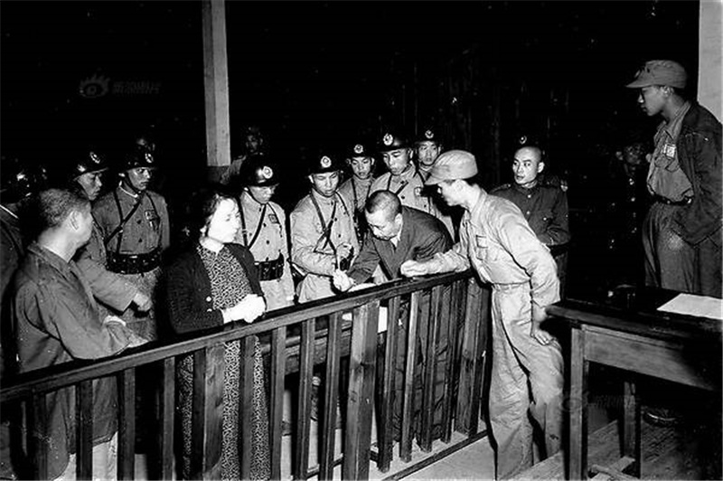 一张照片是在行刑前的仪式中,吴石正在低头写遗书。荷枪实弹的军警围绕,朱枫着花旗袍披针织外套,双手交叠搭靠在栏杆上,放松又淡然,仿佛环境与她无关。