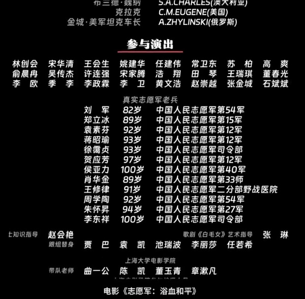 该片由陈凯歌执导,张珂担任编剧,诸多明星参演,阵容强大。而在片尾,出现了12个名字令观众们动容。他们是真实的志愿军老兵,年龄都已超过80岁,有的老兵已经100岁了。