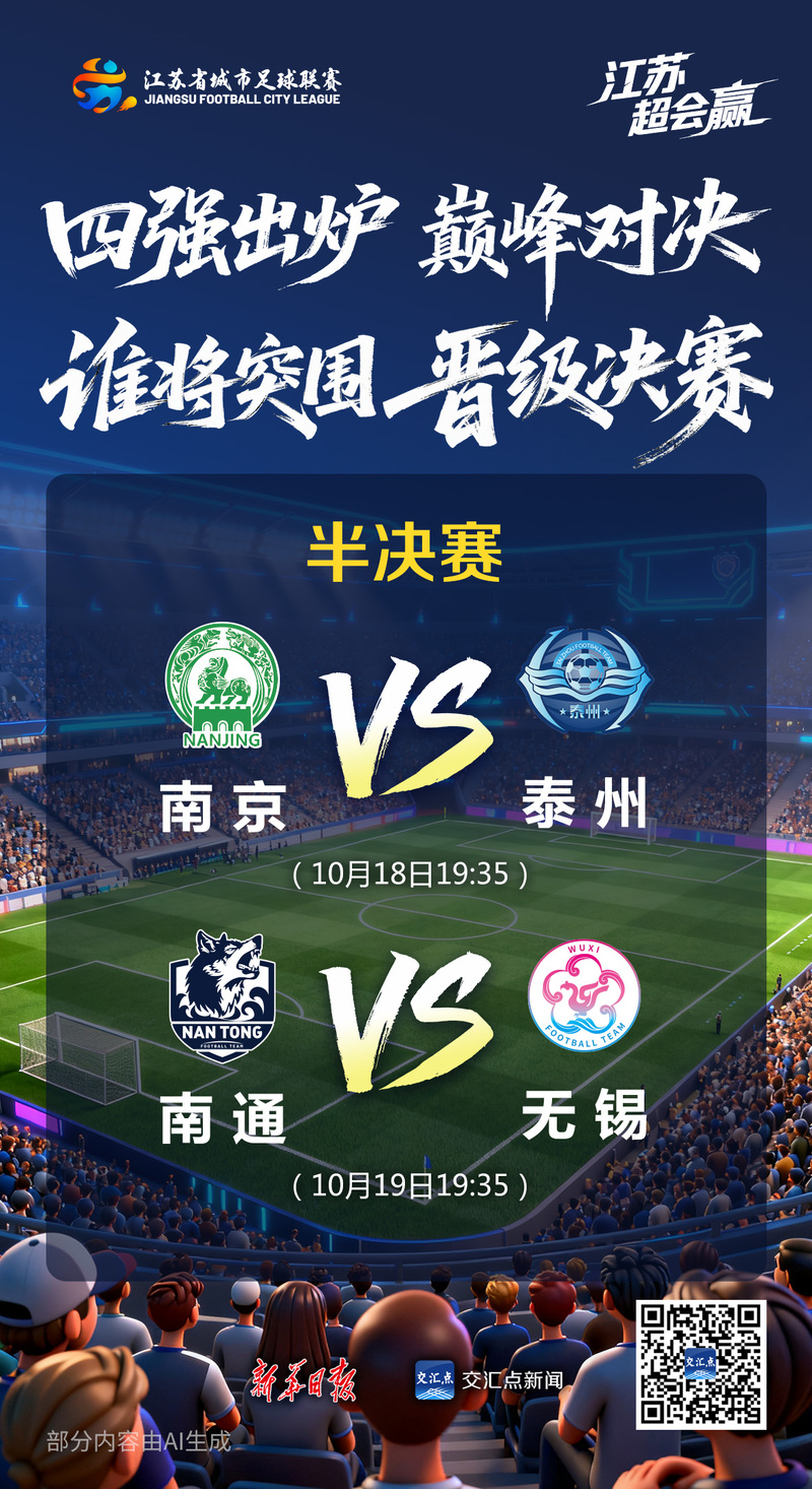 交汇点讯 10月4日至8日,江苏省城市足球联赛1/4决赛战鼓擂响。比赛最终结果为南京队5比3战胜连云港队,徐州队3比5负于泰州队,南通队5比0战胜淮安队,盐城队0比3不敌无锡队。根据“苏超”赛制,排名在前者拥有主场优势。“苏超”半决赛将在10月18日、19日举行,南京队将对决泰州队,南通队将对决无锡队,决赛将于11月1日在南京奥体中心体育场举行。
