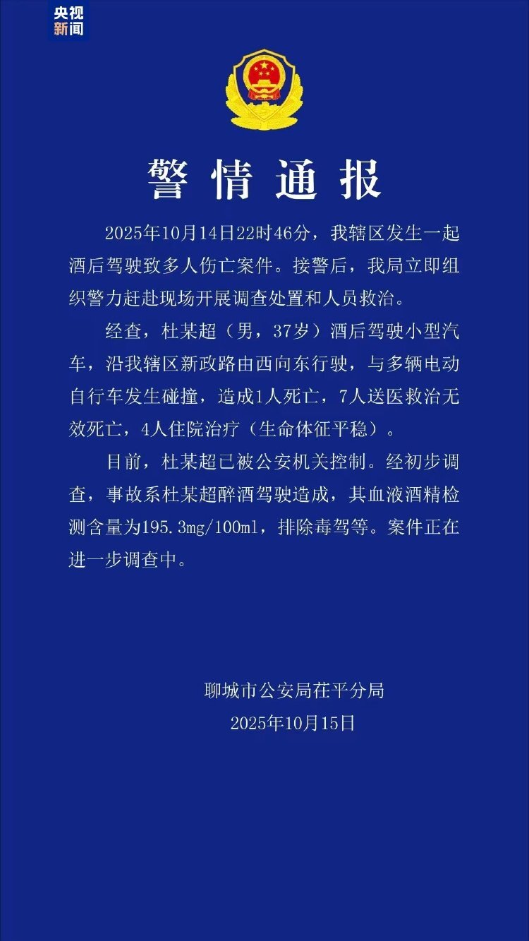 今天,山东聊城公安局茌平分局发布警情通报:10月14日22时46分,辖区发生一起酒后驾驶致多人伤亡案件。经查,杜某超(男,37岁)酒后驾驶小型汽车,沿辖区新政路由西向东行驶,与多辆电动自行车发生碰撞,造成1人死亡,7人送医救治无效死亡,4人住院治疗(生命体征平稳)。