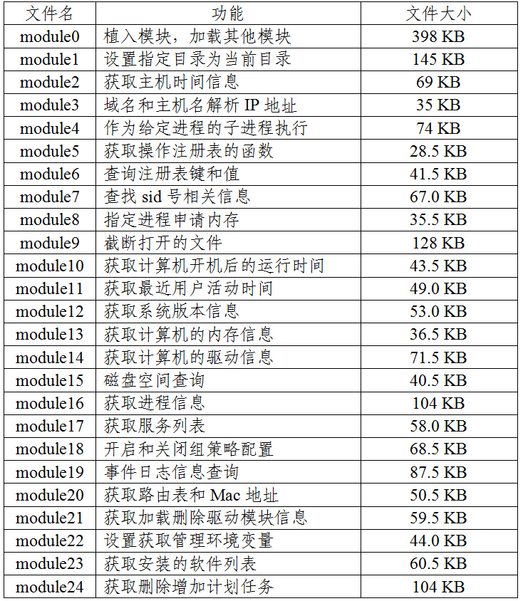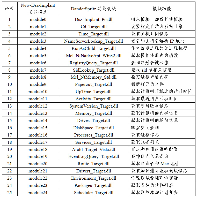 “New-Dsz-Implant”由“eHome_0cx”加载运行,在攻击活动中配合“Back_Eleven”所搭建的数据传输链路使用。其自身无具体窃密功能,需通过接收主控端指令加载功能模块,实现各项窃密功能。本次网攻事件中,攻击者使用“New-Dsz-Implant”加载了25个功能模块,各模块功能情况如下表所示。