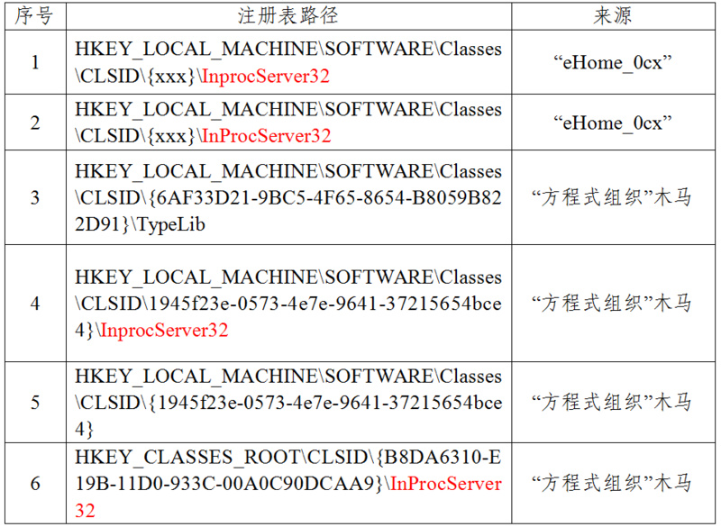“eHome_0cx”的部分驻留文件通过修改注册表InprocServer32键值的方式,劫持了系统正常服务,在系统正常程序启动前加载实现自启动。注册表修改位置与NSA“方程式组织”所使用网攻武器相同,均位于HKEY_LOCAL_MACHINE\SOFTWARE\Classes\CLSID下随机ID项的InProcServer32子项。