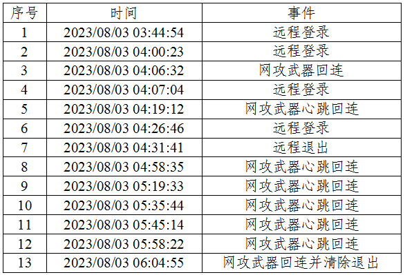 2023年4月11日至8月3日,攻击者利用匿名通信网络节点远程登录办公计算机共80余次,并以该计算机为据点探测授时中心网络环境。