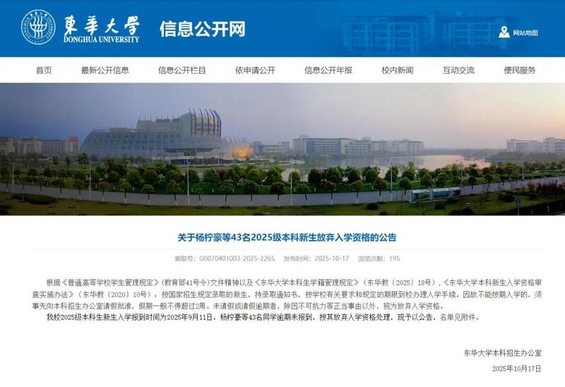 近日,东华大学在学校官网上发布关于43名2025级本科新生放弃入学资格的公告,引发关注。