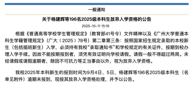 广州大学教务处10月11日就发布公告称,有196名2025级本科生逾期未报到,按其放弃入学资格处理。