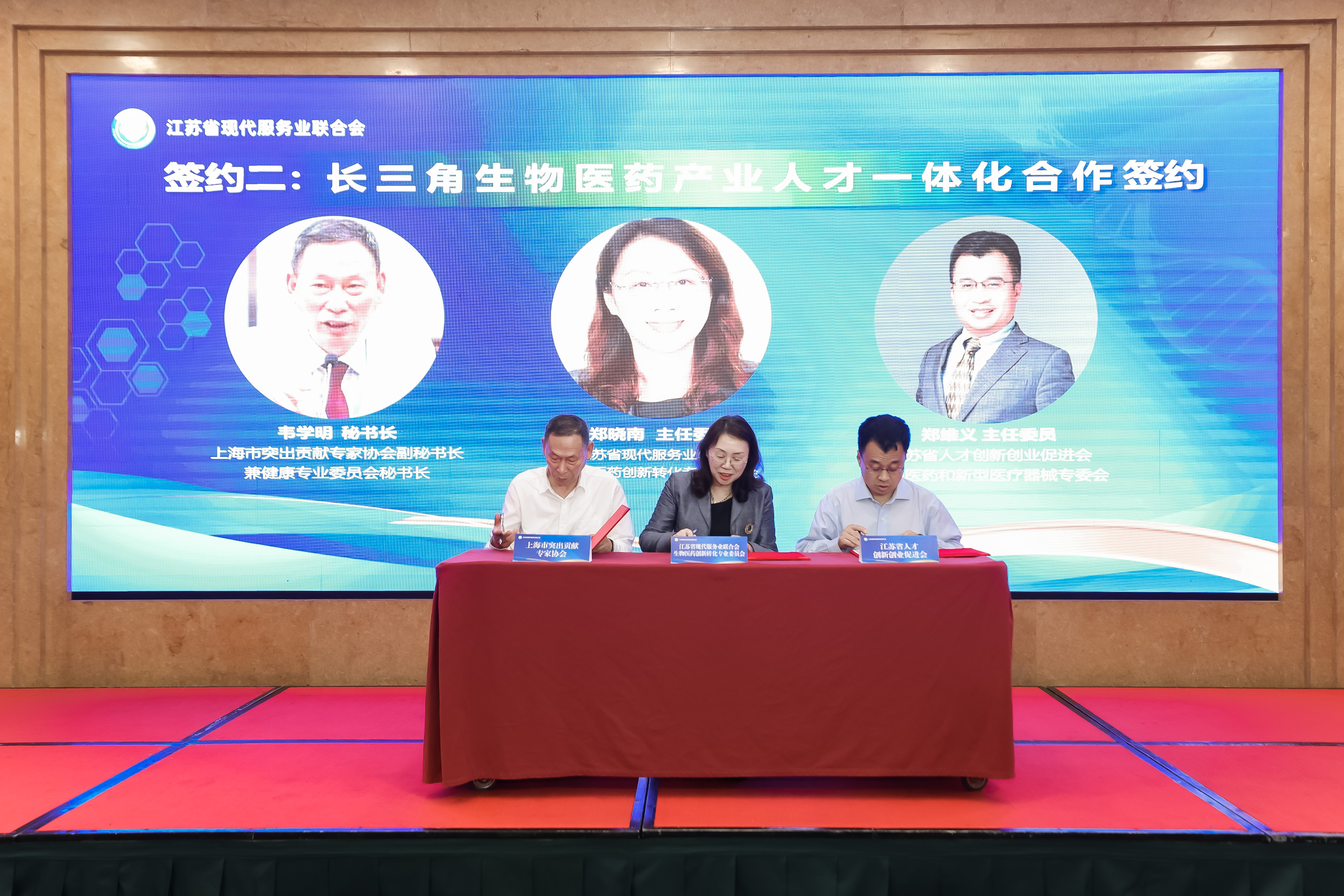 在专委会成立会议上,江苏省现代服务业联合会和海门经济技术开发区管委会签署战略合作协议;上海市突出贡献专家协会、江苏省人才创新创业促进会分别与专委会签署长三角医药产业人才一体化合作协议。