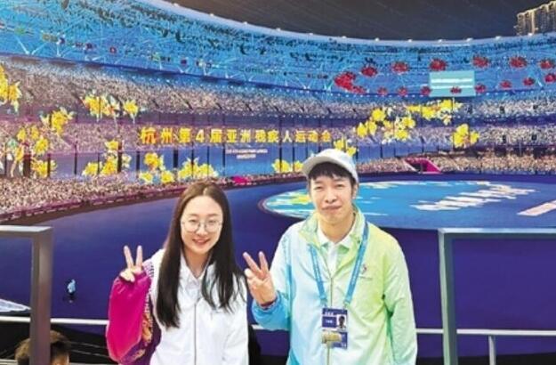 10月22日晚,当杭州第4届亚残运会开幕式结束,热情和欢呼随着观众离场慢慢散去后,静谧的“大莲花”中层看台上,璀璨的灯光不时照亮着一个身影,他看起来腿脚略有不便,但是却细心地检查着每一处观众座席。他是中国残疾人田径运动员、小青荷朱檑(右),从被助到助人,朱檑换个身份回赛场。图源:潮新闻