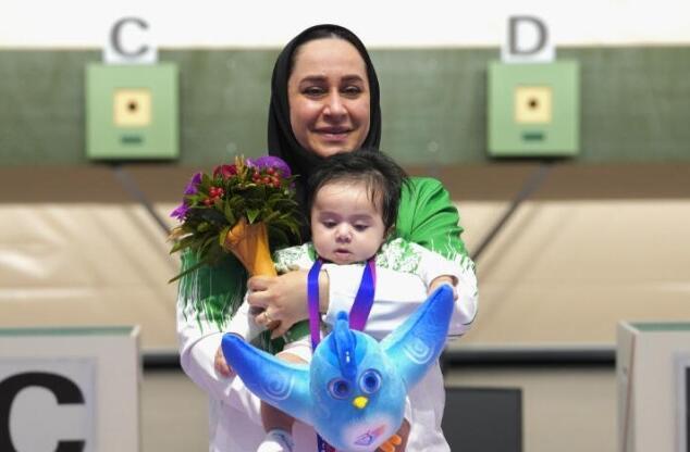 10月24日傍晚,富阳银湖体育中心,杭州亚残运会射击项目SH1级女子10米气手枪颁奖仪式上,银牌得主、杭州亚残运会伊朗代表团射击运动员萨雷赫·贾万马尔迪抱着她三个月大的宝宝走向领奖台。处在哺乳期的她本打算放弃这次参赛机会,带着三个月的宝宝参赛对她来说“是一种意外的幸福”。图源:潮新闻