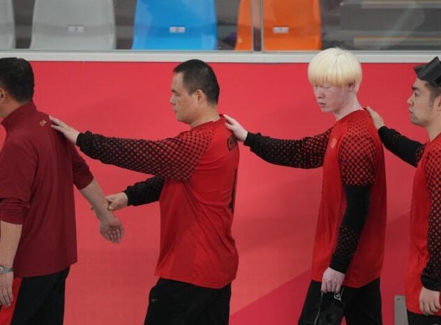 10月26日,在杭州亚残运会男子盲人门球半决赛中,中国男子盲人门球队队员们一个接一个扶着前面队友的肩膀出场。图源:潮新闻