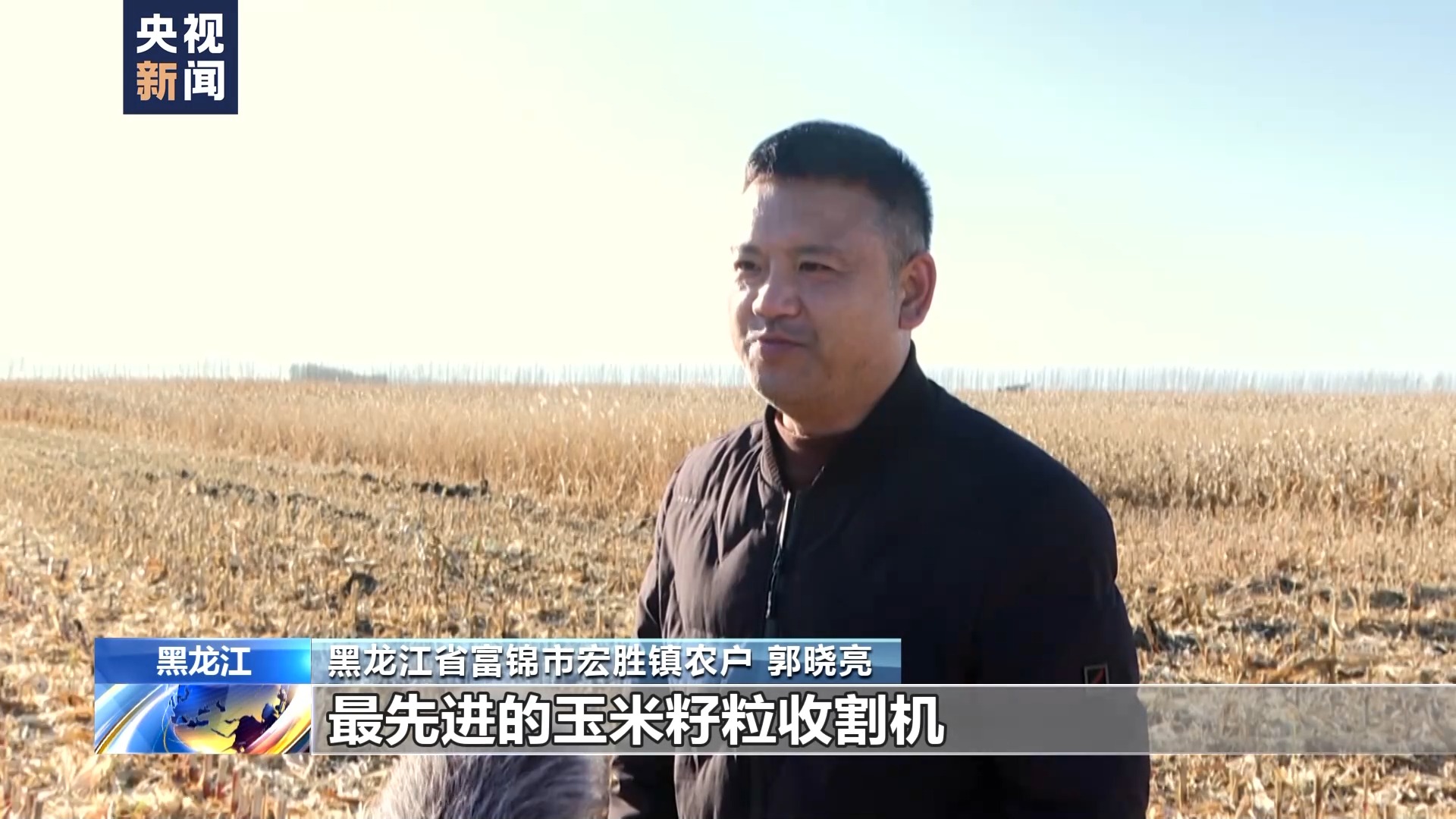 黑龙江省富锦市宏胜镇农户 郭晓亮:今年我家用的是最先进的玉米籽粒收割机,我家二十多垧地,六七个小时就能收完。