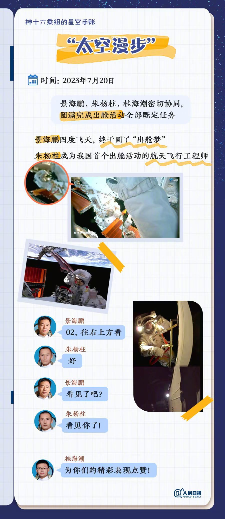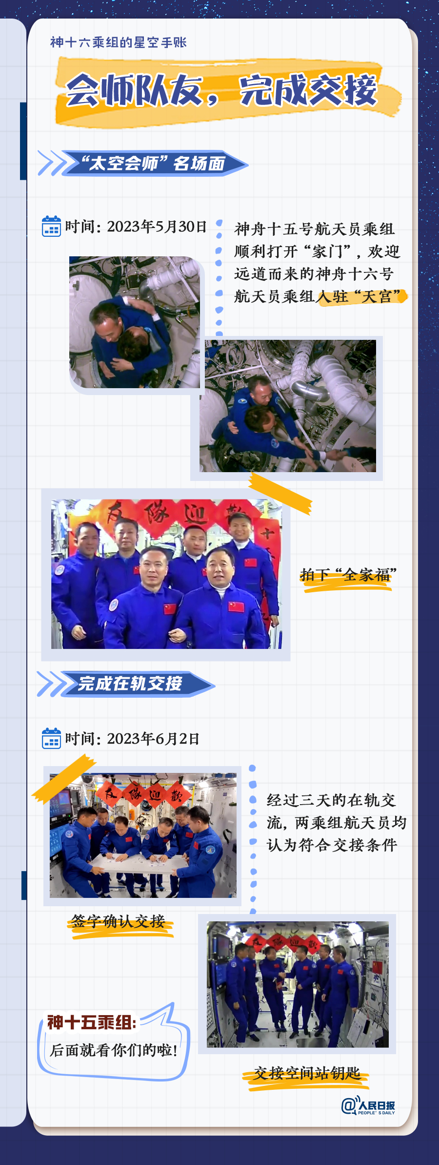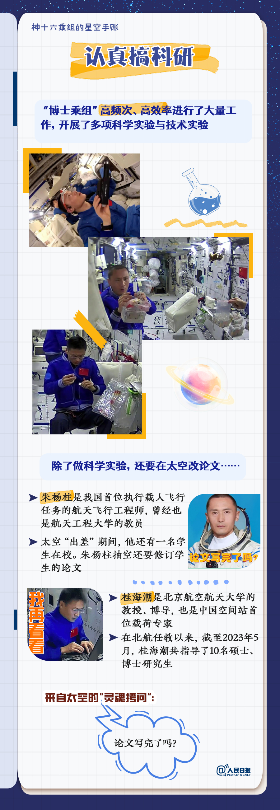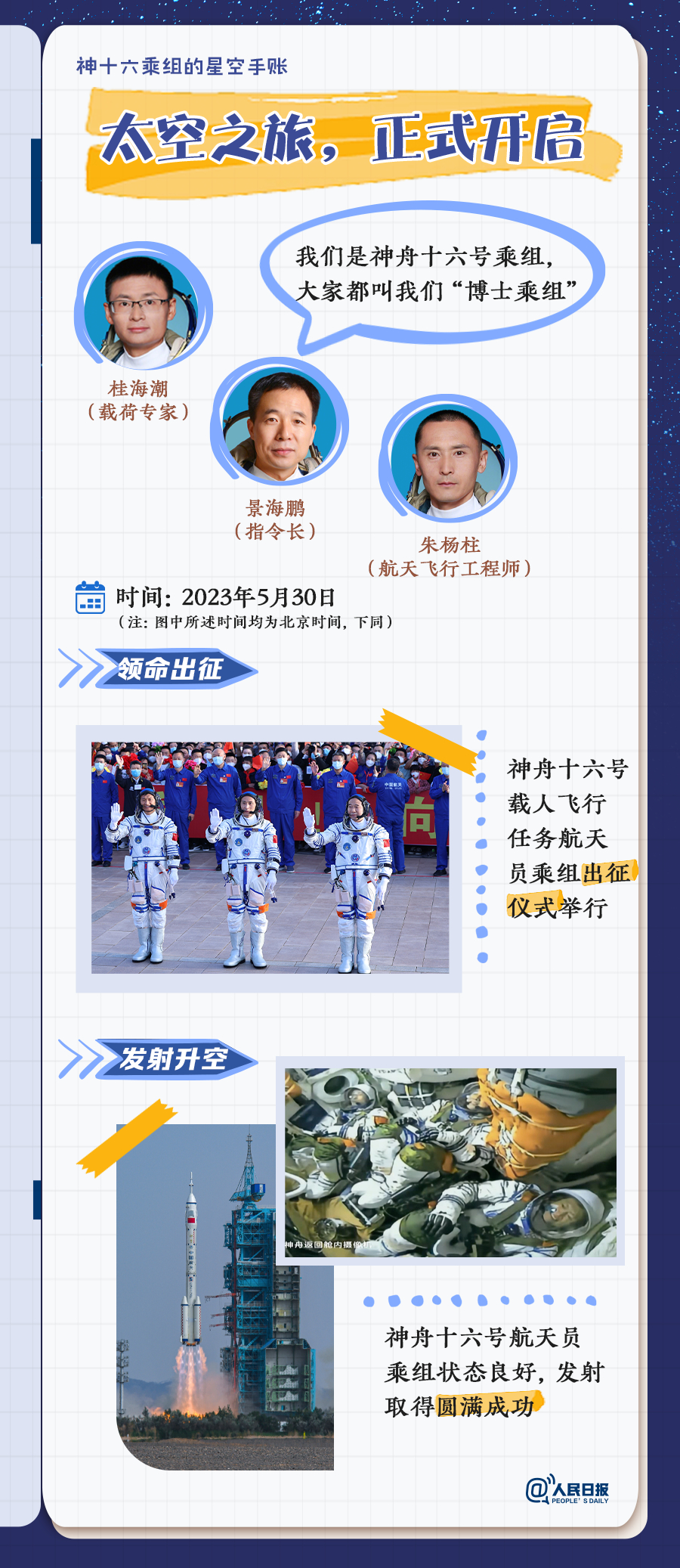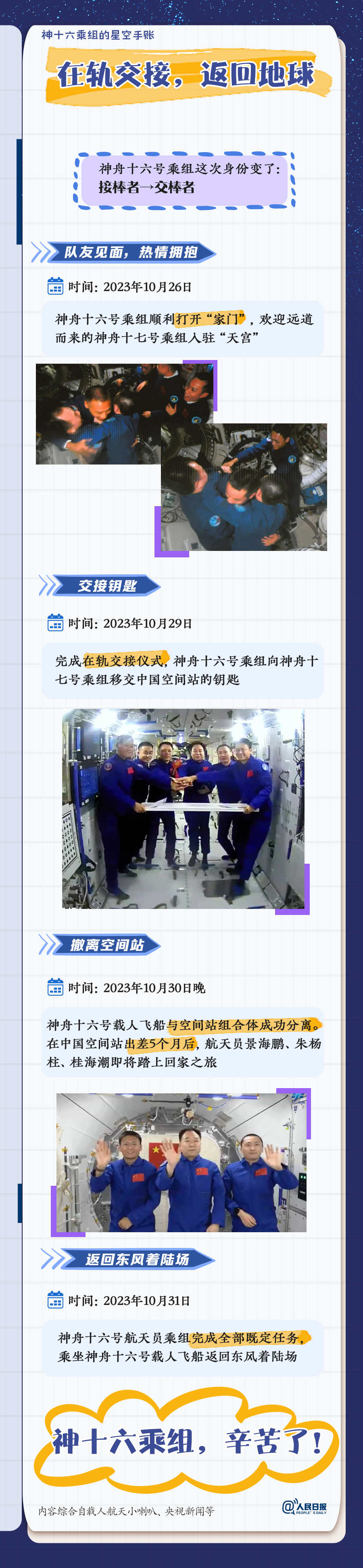 今天,神十六航天员景海鹏、朱杨柱、桂海潮平安返回地球。5个月的太空“出差”,“博士乘组”不仅完成了出舱任务、科研工作、太空授课,还自己种菜、给学生改论文……一组手账回顾神十六太空之旅。