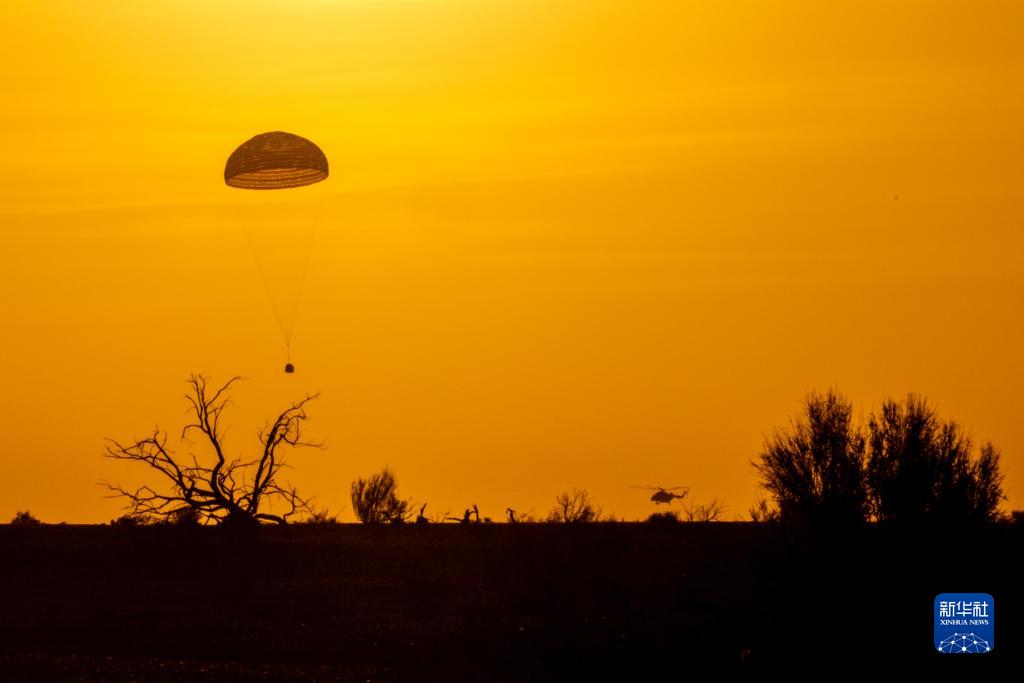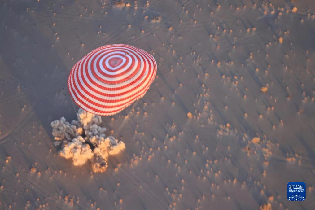神舟十六号凯旋归家,“神舟大伞”绽放天地之间,红白伞花绚丽无比。