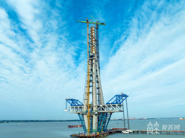 在泰兴市虹桥镇的长江岸边,放眼望去,江心高耸的常泰长江大桥钻石型主塔高350米,引人注目,为世界在建最高桥塔。截至目前,常泰长江大桥钢桁梁吊装作业有序推进,大桥两座主塔都已完成封顶,天星洲专用航道桥钢桁梁架设也进入冲刺阶段,预计十二月实现跨中合龙。
