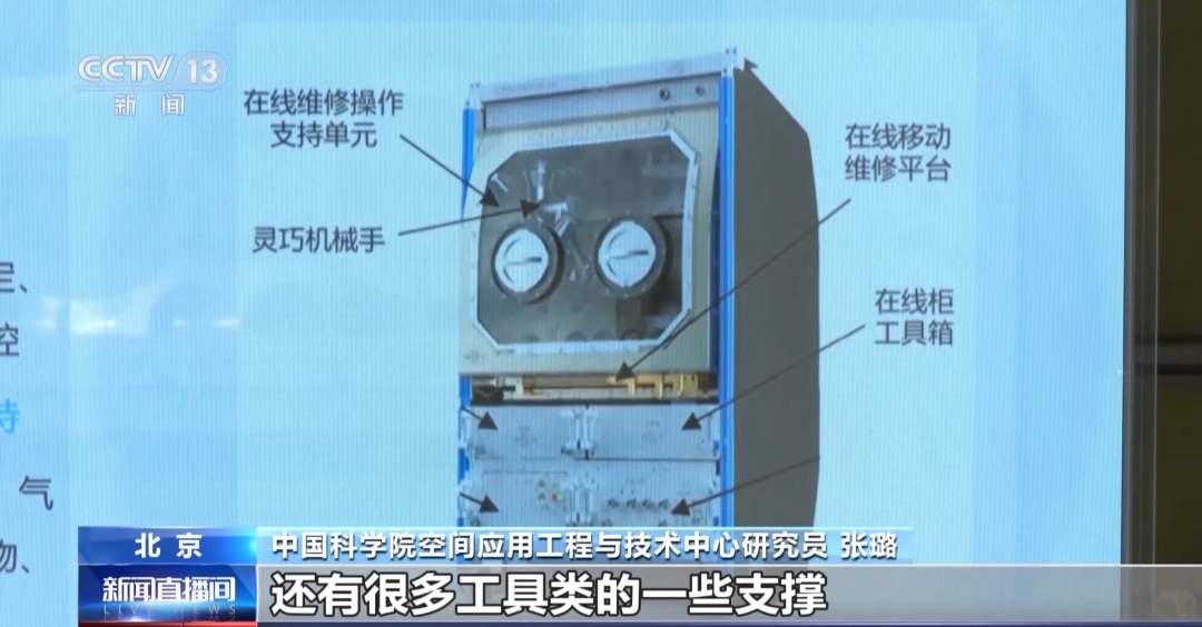 中国科学院空间应用工程与技术中心研究员 张璐:其他的实验柜都属于科学实验柜,它都会有一个或者是多个比较固定的研究主题。我们这个实验柜,它实际上更多的是一个支撑类的实验柜,它并没有很独立的研究方向。像以前,有些(设备)比如说坏了,咱们航天员不是很方便地去进行在轨的维修和更换。那我们这个在线实际上就是指的是在轨的状态下,航天员可以对其他的科学实验柜,包括其他的空间应用系统的一些载荷装置,更换、维修,或者操作需求的时候,这个实验柜提供了一系列的包括结构安装、洁净空间的处理,包括还有机械臂手的辅助操作,还有相应的一些真空、排废气,还有很多工具类的一些支撑,来保障我们这些维修操作能够在轨顺利展开。
