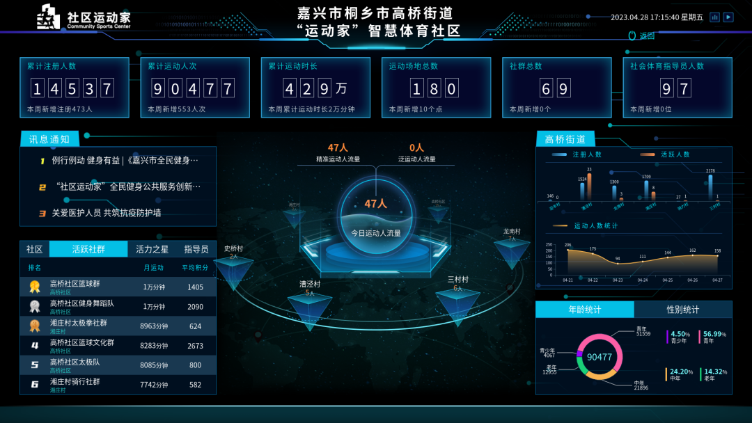 走进“运动家”智慧体育社区现场,记者发现在桐乡永乐村的“百姓健身房”里,就有这样的大数据服务。健身房的屏幕上,可以清晰地看到每天的社区运动人数、运动人群时间活跃图、社区运动年龄比例统计等数据。而在屏幕的一角,还有社群运动时长排名和社区群众运动时长排名,带动形成更好的全民健身氛围。