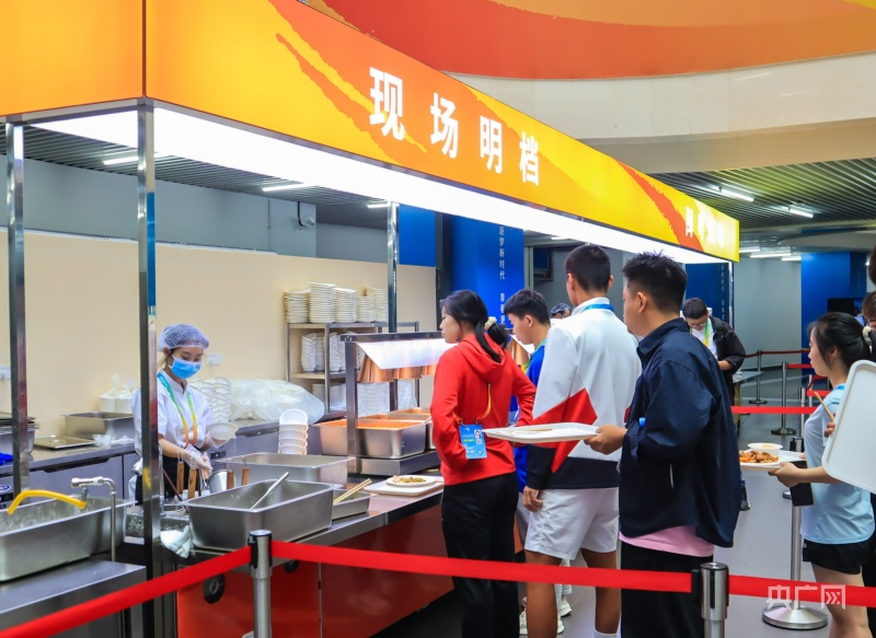 在运动员餐厅,苏浙风味、川湘风味、闽粤风味等不同地域菜系的窗口清晰可见,冷荤、水果、饮料、汤粥、西餐等菜肴应有尽有,满足来自全国各地运动员的需求。运动员餐厅采用辅助、自助餐形式供餐,所有食品、饮料等均不限量供应。此外,餐厅设置了生日角,运动员可在前台预定生日餐,餐厅工作人员会向运动员提供生日蛋糕、长寿面、鲜花,一起为他唱生日歌庆祝,让运动员们在紧张的比赛之余能够放松身心,享受到独特的快乐。