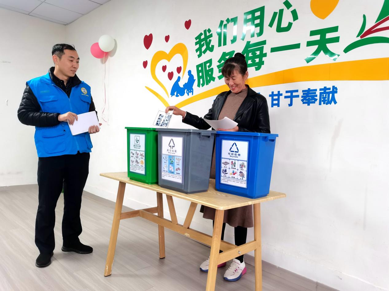 活动现场,志愿者向现场村民介绍垃圾分类类型、分类收运过程及分类处置去向,并邀请村民代表通过分类卡片投放提升对分类垃圾的认知度。最后,志愿者通过交流的方式了解村民在日常分类中遇到的问题及难点,共同探讨解决方法。