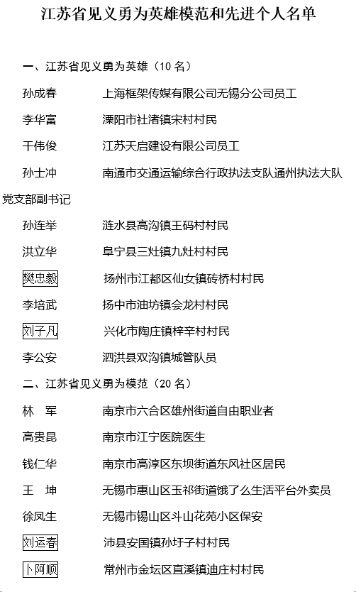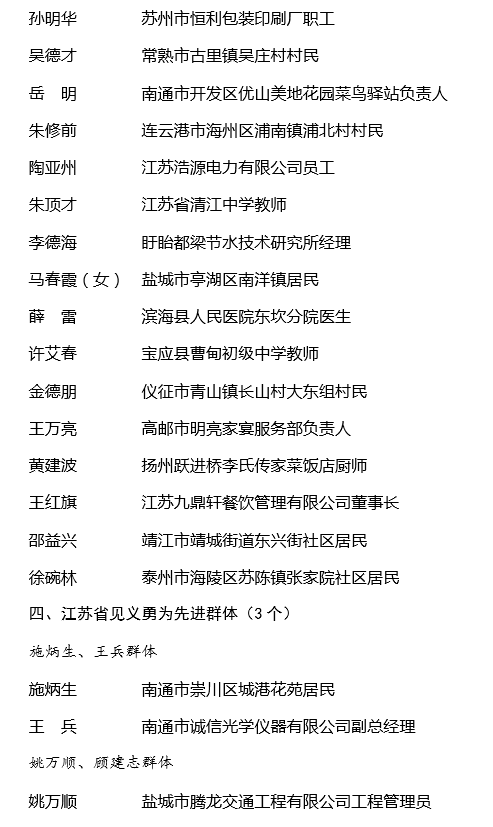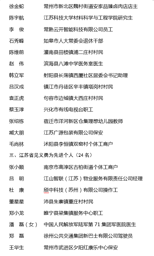 交汇点讯 为全面贯彻落实党的二十大精神,深入学习贯彻习近平总书记关于见义勇为事业的重要指示精神,认真践行社会主义核心价值观,大力弘扬社会正气,倡导见义勇为,根据《江苏省奖励和保护见义勇为人员条例》,省人民政府决定,授予孙成春等8位同志和追授樊忠毅、刘子凡同志“江苏省见义勇为英雄”称号;授予林军等18位同志和追授刘运春、卜阿顺同志“江苏省见义勇为模范”称号;授予张小顺等24位同志“江苏省见义勇为先进个人”称号;授予施炳生、王兵群体等3个群体“江苏省见义勇为先进群体”称号。