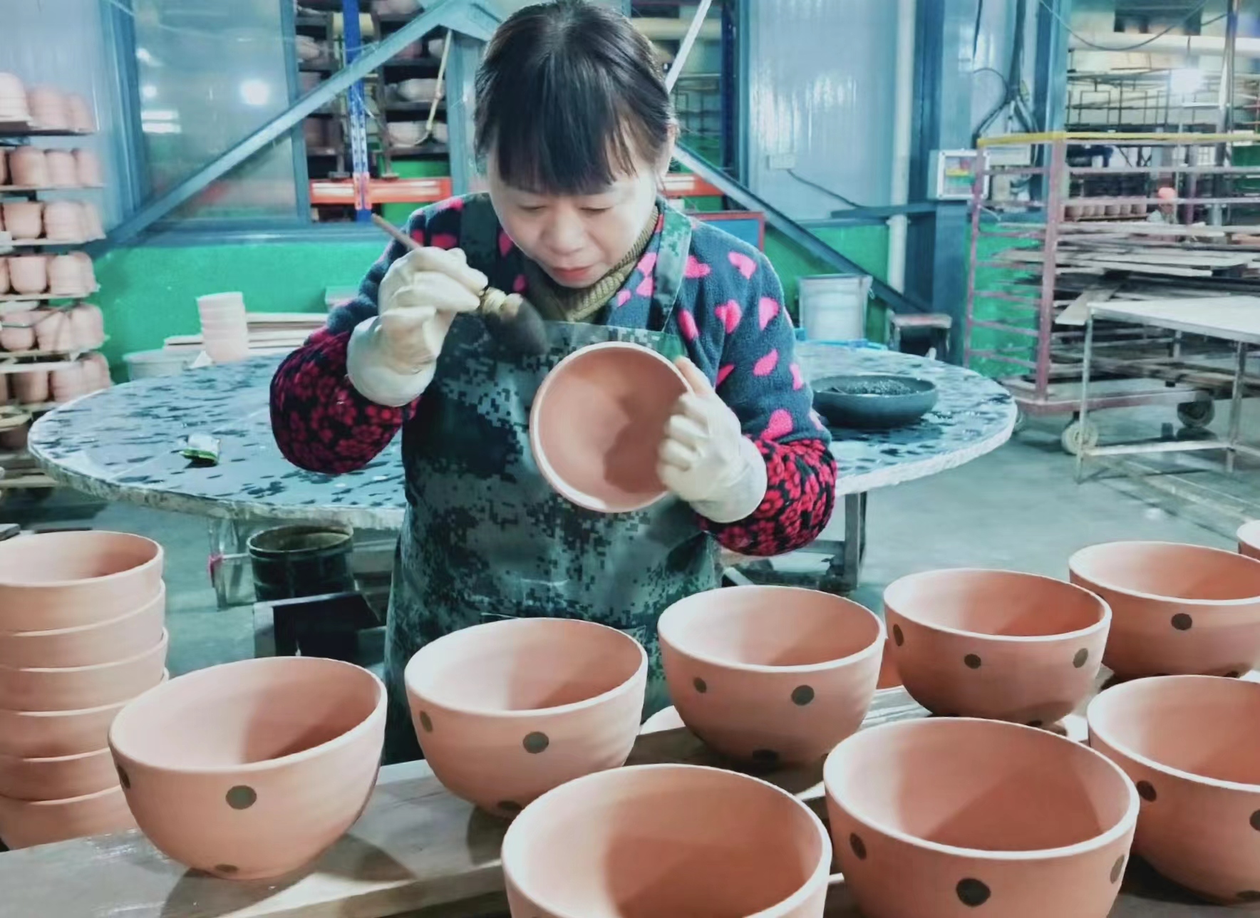 在南京弥盛陶瓷制品有限公司,施釉工动作麻利,质检工专心查验,车间内一派繁忙景象。近年来,公司成功把握住外贸市场追求自然复古之风的趋势,专注产销粗陶炻器餐具,月销售陶瓷93万件,2023年全年订单无空档,2024年一季度订单也已排满。今年,企业投入160万元新添了两条全自动生产线,进一步扩大了产能,1-10月,企业销售额达7000万元。