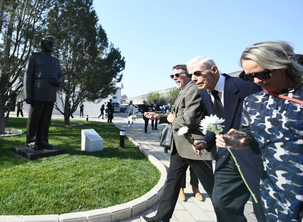10月30日,飞虎队老兵哈里·莫耶(中)在中国人民抗日战争纪念馆向陈纳德将军雕像献花。
