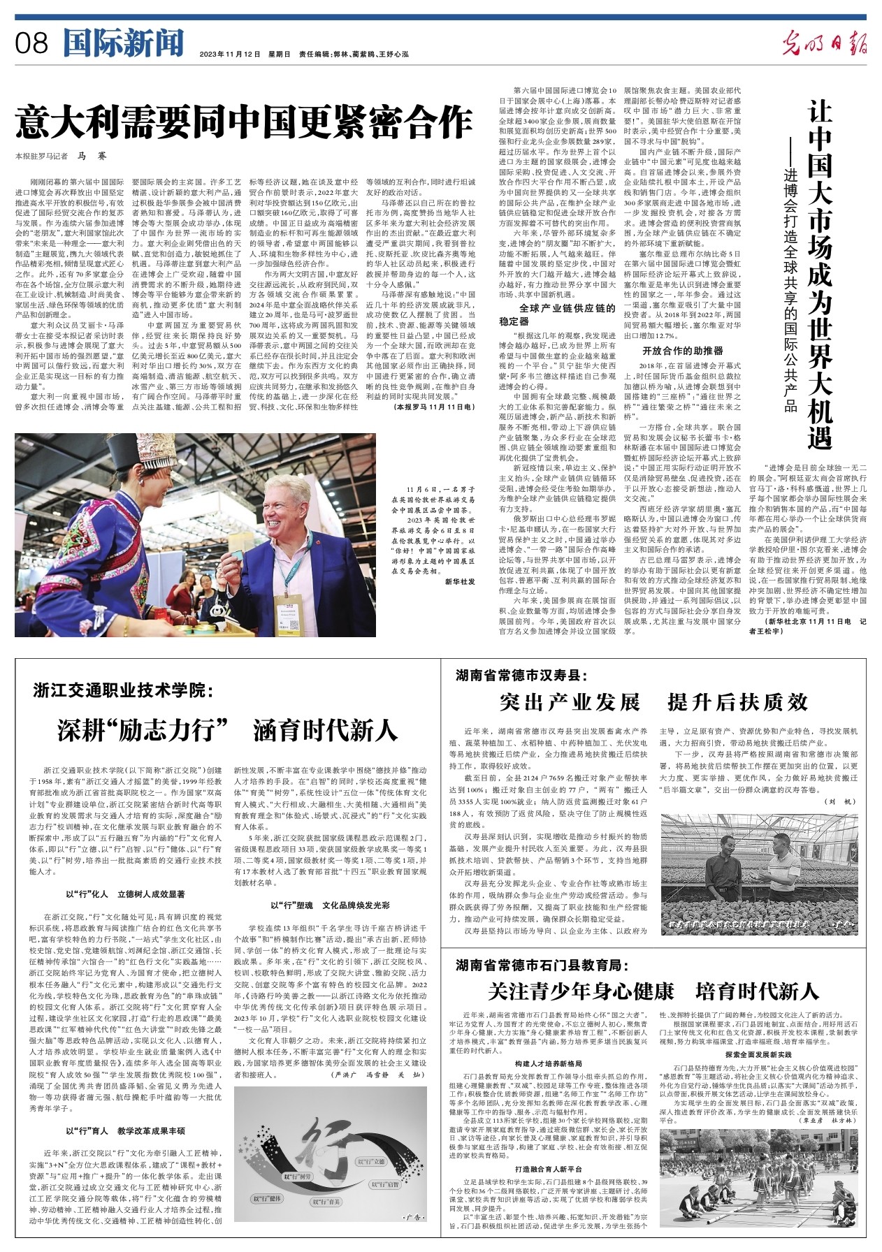 意大利一向重视中国市场,曾多次担任进博会、消博会等重要国际展会的主宾国。许多工艺精湛、设计新颖的意大利产品,通过积极赴华参展参会被中国消费者熟知和喜爱。马泽蒂认为,进博会等大型展会成功举办,体现了中国作为世界一流市场的实力。意大利企业则凭借出色的天赋、直觉和创造力,敏锐地抓住了机遇。马泽蒂注意到意大利产品在进博会上广受欢迎,随着中国消费需求的不断升级,她期待进博会等平台能够为意企带来新的商机,推动更多优质“意大利制造”进入中国市场。
