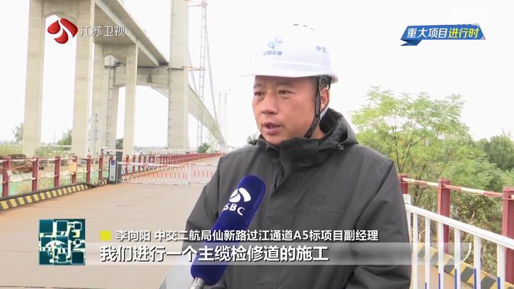 中交二航局仙新路过江通道A5标项目副经理李向阳说:“目前正在进行缠包带的施工,它是主缆防腐除湿系统里面重要工序,缠包带施工完成之后,进行主缆检修道的施工。”
