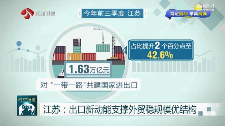 今年以来,江苏充分发挥先进制造业产业优势,积极响应共建“一带一路”国家推进工业化、现代化和提高基础设施水平的迫切需要,加大汽车、船舶、高铁、电工器材及相关零部件等产品出口力度,前三季度,江苏对 “一带一路”共建国家进出口1.63万亿元,占比提升2个百分点至42.6%。