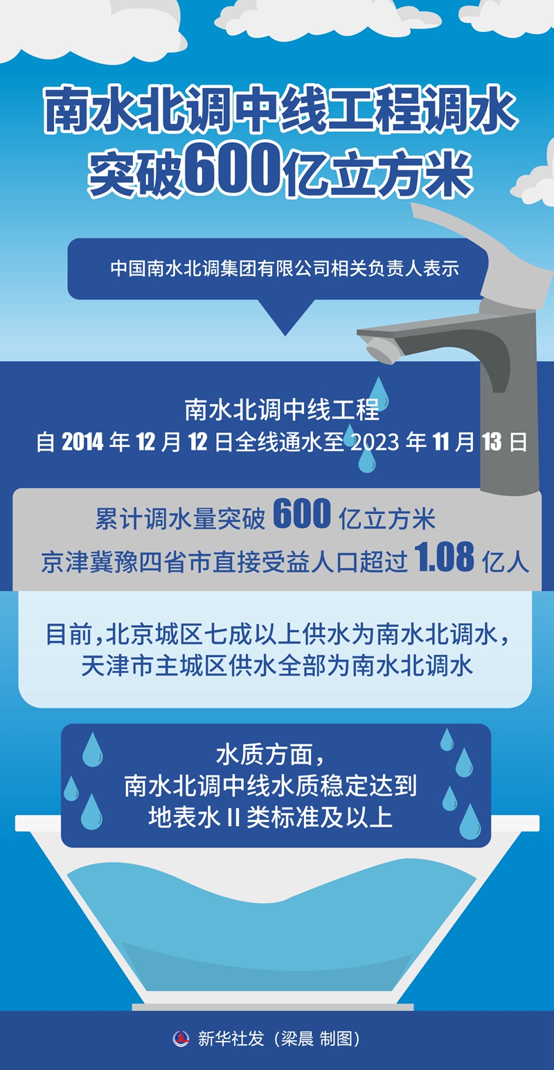 新华社北京11月13日电(记者刘诗平)南水北调中线工程自2014年12月12日全线通水至11月13日,累计调水量突破600亿立方米,京津冀豫四省市直接受益人口超过1.08亿人。