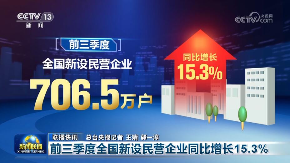 另外,市场监管总局今天公布数据显示,前三季度,全国新设民营企业706.5万户,同比增长15.3%。截至今年9月底,全国登记在册民营企业数量超过5200万户,民营企业在企业总量中的占比达到92.3%。