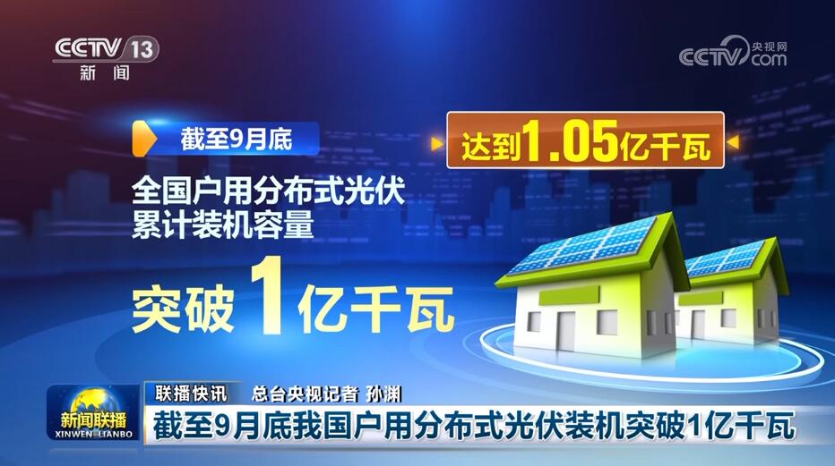 截至9月底,全国户用分布式光伏累计装机容量突破1亿千瓦,达到1.05亿千瓦。今年前9个月,全国户用分布式光伏新增装机3297.7万千瓦,是去年全年的1.3倍。