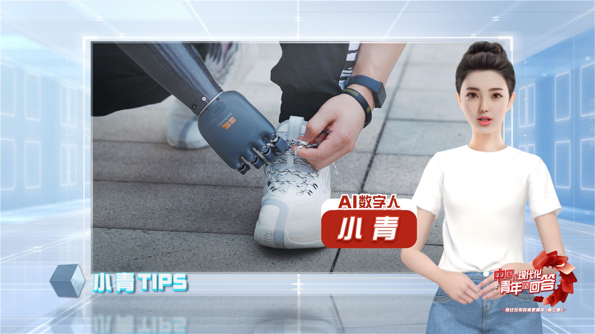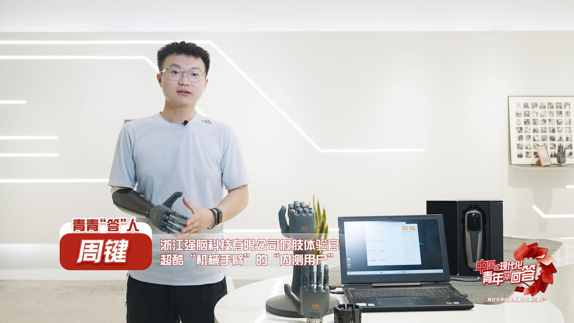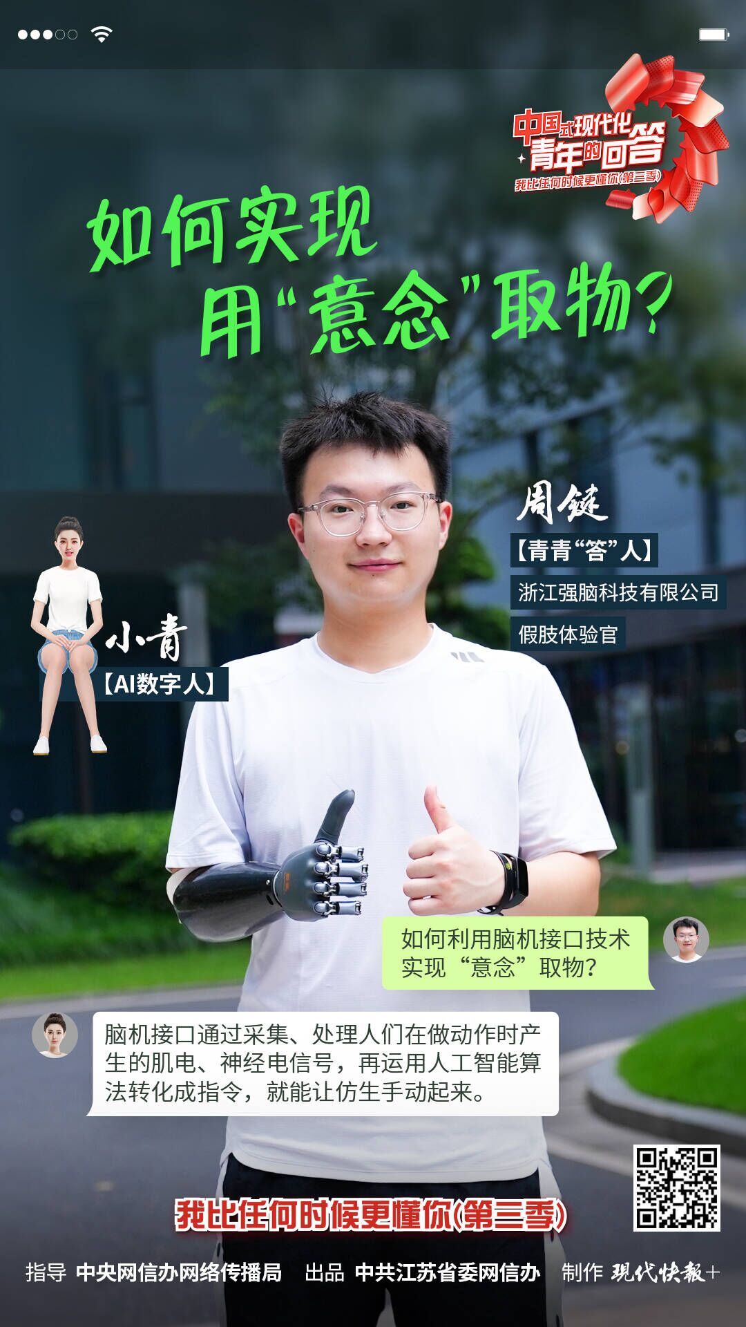 11月16日,“中国式现代化·青年的回答——我比任何时候更懂你(第三季)”系列短视频之《如何实现用“意念”取物?》正式上线。本集视频中,青青“答”人——浙江强脑科技有限公司假肢体验官周键佩戴上智能仿生手,和AI数字人小青一起展示智能仿生手是如何利用脑机接口技术实现“意念”取物,又是如何帮助残障人士修复肢体功能、重新建立信心。在他的介绍下,脑机接口的神秘世界逐渐呈现在眼前。