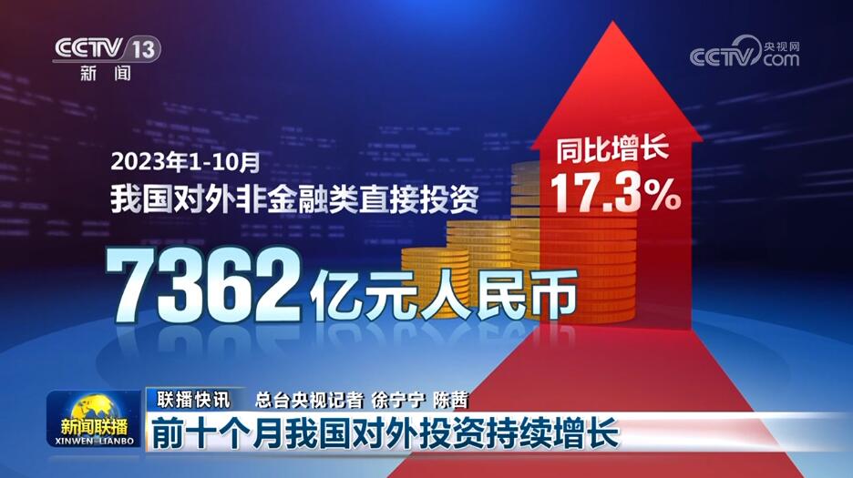 商务部今天公布的最新数据显示,今年前十个月,我国对外投资数据持续增长。1—10月,我国对外非金融类直接投资7362亿元人民币,同比增长17.3%;我国对外承包工程完成营业额8568.8亿元人民币,同比增长8.3%。