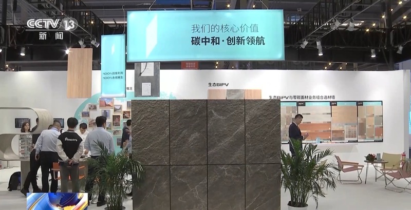参展商 麦欣静:零碳面材我们是直接使用固废作为生产原材料,保证了它的碳足迹足够低。生产过程中全程使用绿电以及当地的火力发电厂排放出来的废蒸气作为我们的能源,没有废水、废气、废渣的排放;等到产品终端废弃了之后,可以直接粉碎,再还原成为我们的原材料,所以实现了我们的产品全生命周期的低碳可持续。