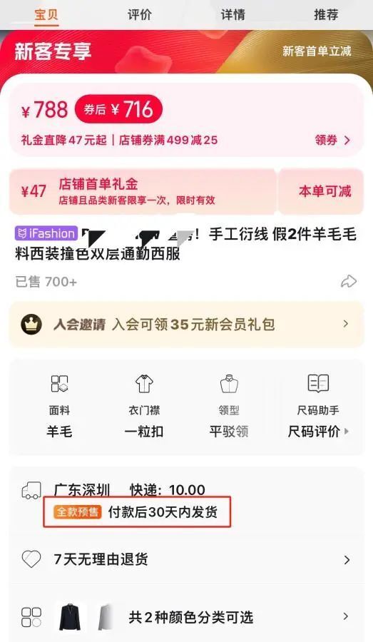而对于国内成品服装,某线上女装店工作人员告诉中新网,现在商家不敢盲目压货,店里预售的衣服的确是还没做,因为不确定这款衣服能不能卖得好。顾客下单之后,店铺再根据这款衣服的“数据”下单,“我们店里出售第一批商品时一般会设置20天预售期,积攒到一定订单量之后批量下单,不会一次性下单”。
