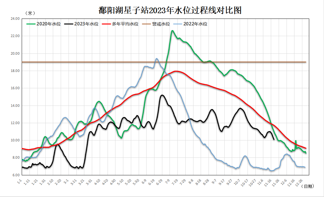 10月8日以来,鄱阳星子站水位快速下降,11月21日15时星子站水位9.99米,退幅3.68米,最大日退幅0.24米(10月15日8时—16日8时)。今年以来鄱阳湖水位整体呈偏低态势。1月至4月中旬,星子站水位始终位于12米枯水位以下,受“端午水”强降雨过程影响,6月29日出现今年以来最高水位15.19米,较历年年最高水位最小值(1972年16.00米)低0.81米。7月至10月,星子站水位基本在11米至14米之间波动。据统计,今年以来鄱阳湖星子站平均水位10.91米,较常年同期均值偏低约2.7米。