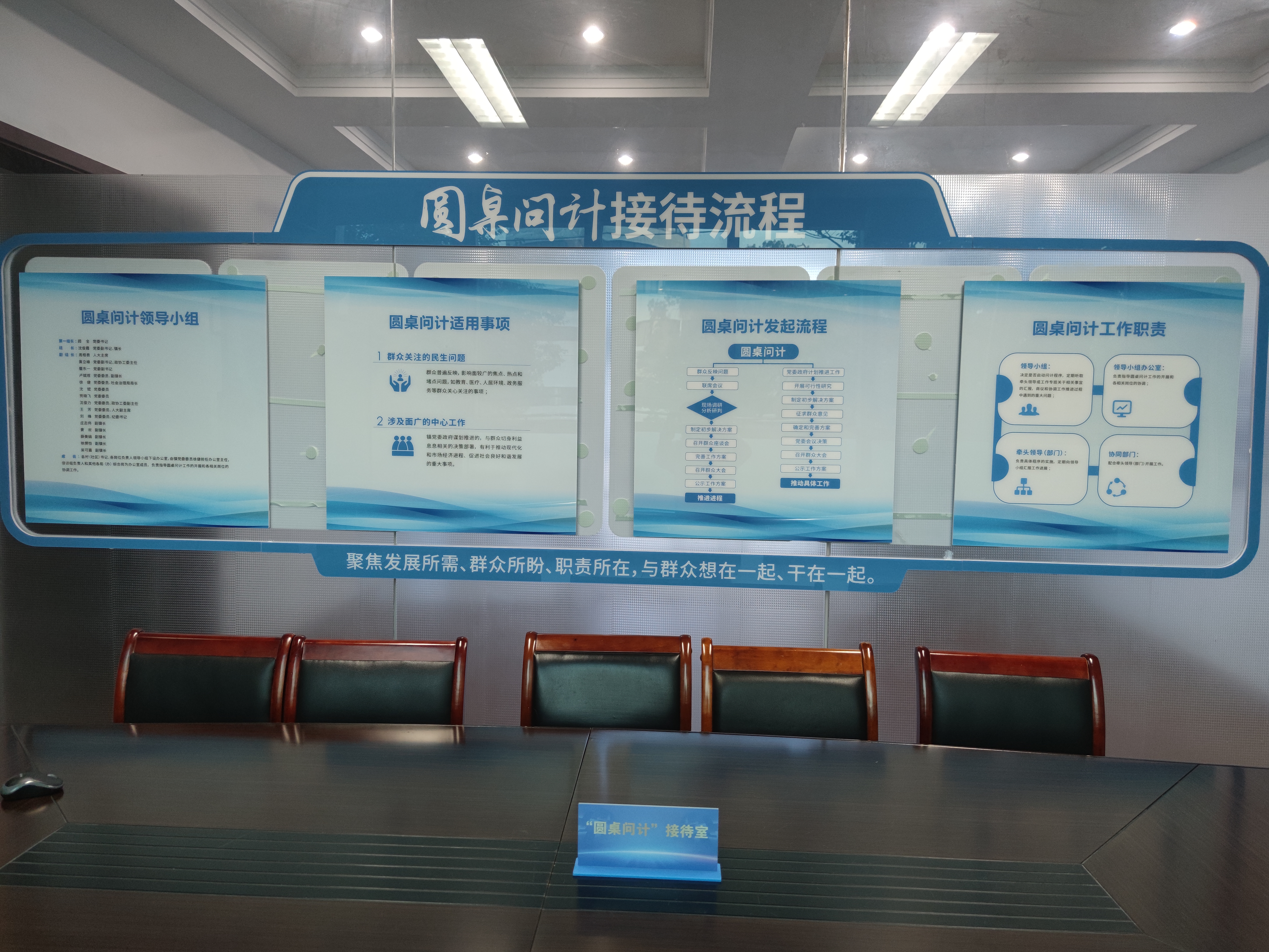 新“前台”体现基层政府为“精微善治”所做的体制机制调整,而楼内的圆桌问计接待室则是该镇固化“圆桌问计”办法的一个体现。