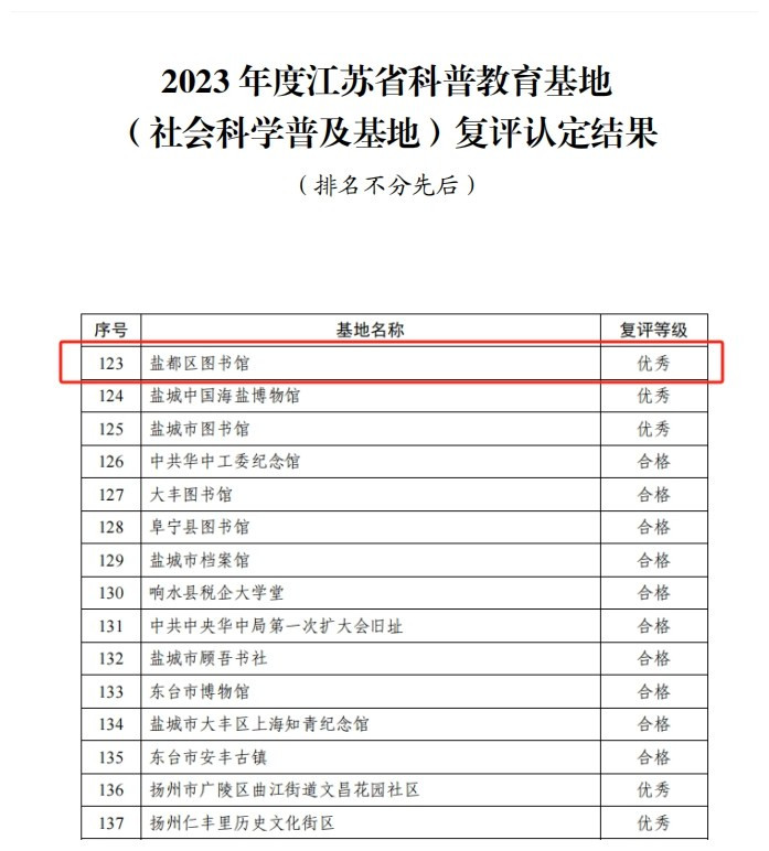 新华报业网讯 11月22日,笔者从盐城市社科联获悉,盐城市盐都区图书馆再次荣获省社科普及基地称号,这是该馆第三次荣获该称号。