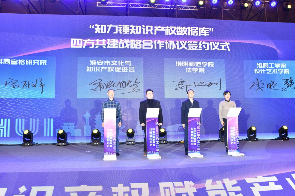 秉持“以知识产权的力量,锤炼出产业发展的新高度”理念,会议现场,共同富裕研究院、淮安市文化与知识产权促进会、淮阴师范学院法学院、淮阴工学院设计艺术学院四方联合签约“知力锤知识产权数据库”战略合作项目。