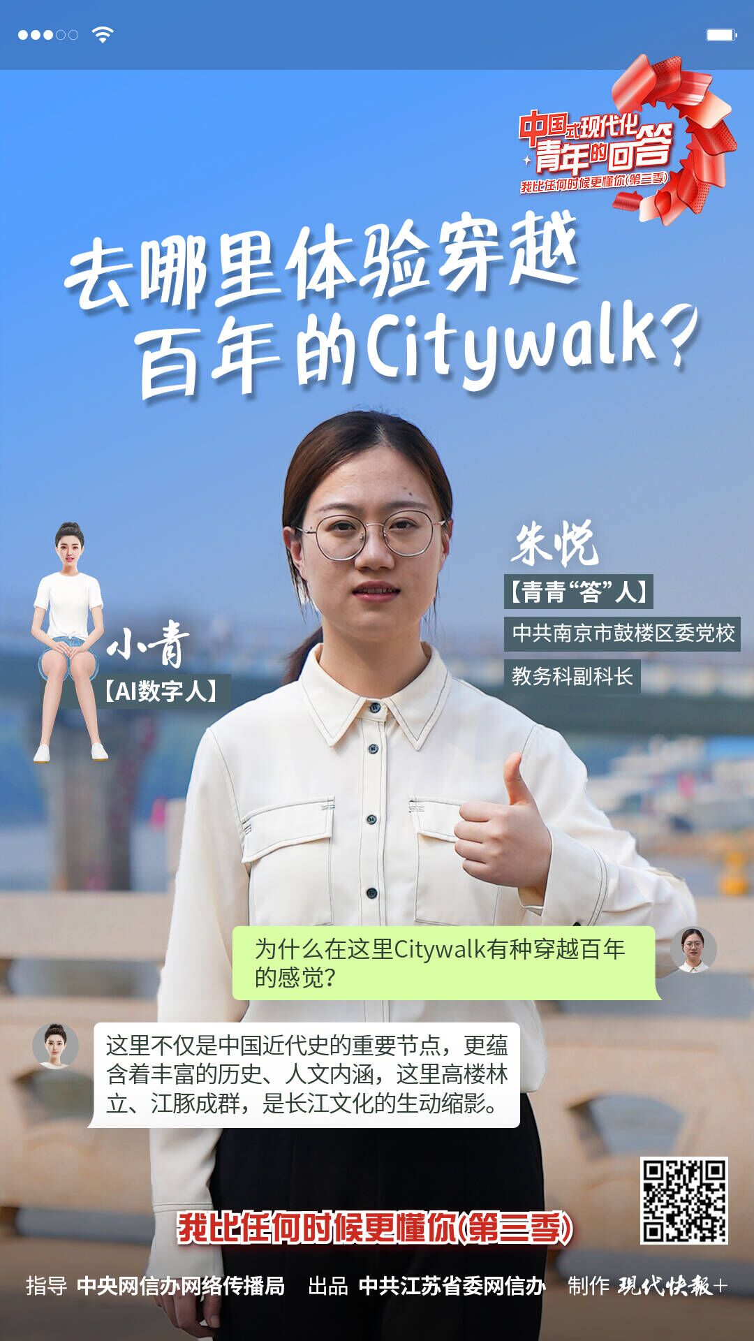 11月25日,“中国式现代化·青年的回答——我比任何时候更懂你(第三季)”系列短视频之《去哪里体验穿越百年的Citywalk?》正式上线。本集视频中,青青“答”人——中共南京市鼓楼区委党校教务科副科长朱悦和AI数字人小青一起在长江边Citywalk,打卡静海寺、中山码头、长江大桥等地,从美景中感受长江的文化内涵,用脚步丈量长江,用美景讲述长江两岸百年间的历史故事。