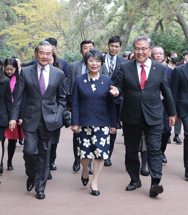 当地时间2023年11月26日,中共中央政治局委员、外交部长王毅在韩国釜山同韩国外长朴振、日本外相上川阳子共同出席第十次中日韩外长会。