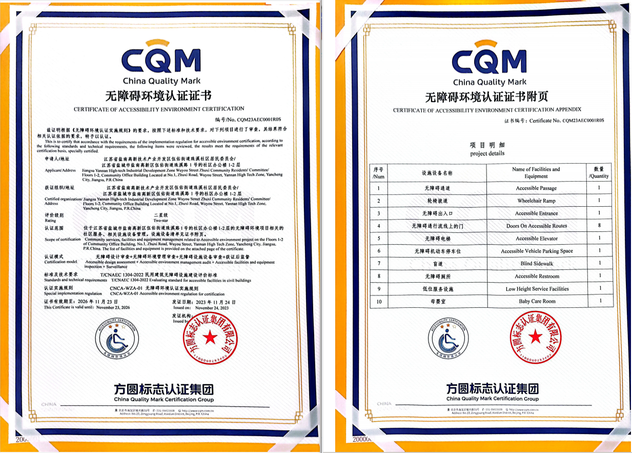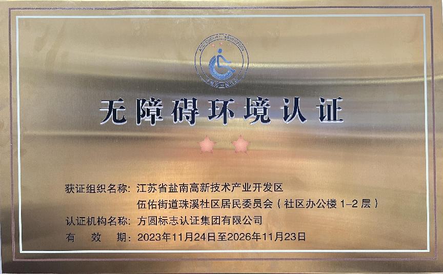新华报业网讯 11月24日,由国家市场监督管理总局认证监督管理司、中国残疾人联合会维权部指导,国家市场监督管理总局认证认可技术研究中心、无障碍环境认证技术委员会、中国助残志愿者协会主办,北京市无障碍环境建设促进中心、中国残疾人事业新闻宣传促进会等单位联合承办的无障碍环境认证宣贯推广活动中,盐南高新区伍佑街道珠溪社区喜获全国首家二星级无障碍环境认证社区。