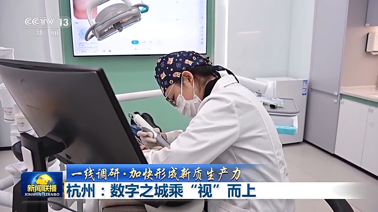 记者在杭州又来到一家牙科诊所,医生正在给患者做牙齿取模。伸到嘴巴里的扫描头,可以实时采集三维数据,误差控制在微米级。