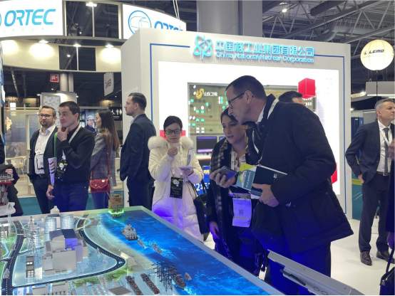 除了专家分享,中国展台也以创新魅力吸引了各国参观者的驻足。例如“核能智慧城市”,通过沙盘灯光与海水、建筑物等的连接,表现了包括华龙一号、玲龙一号、高温气冷堆、聚变堆、核医疗等中国核科技成果在发电、海水淡化、制氢、石油化工等方面的多元化应用,展示了核能在未来人类生活中的无限可能。