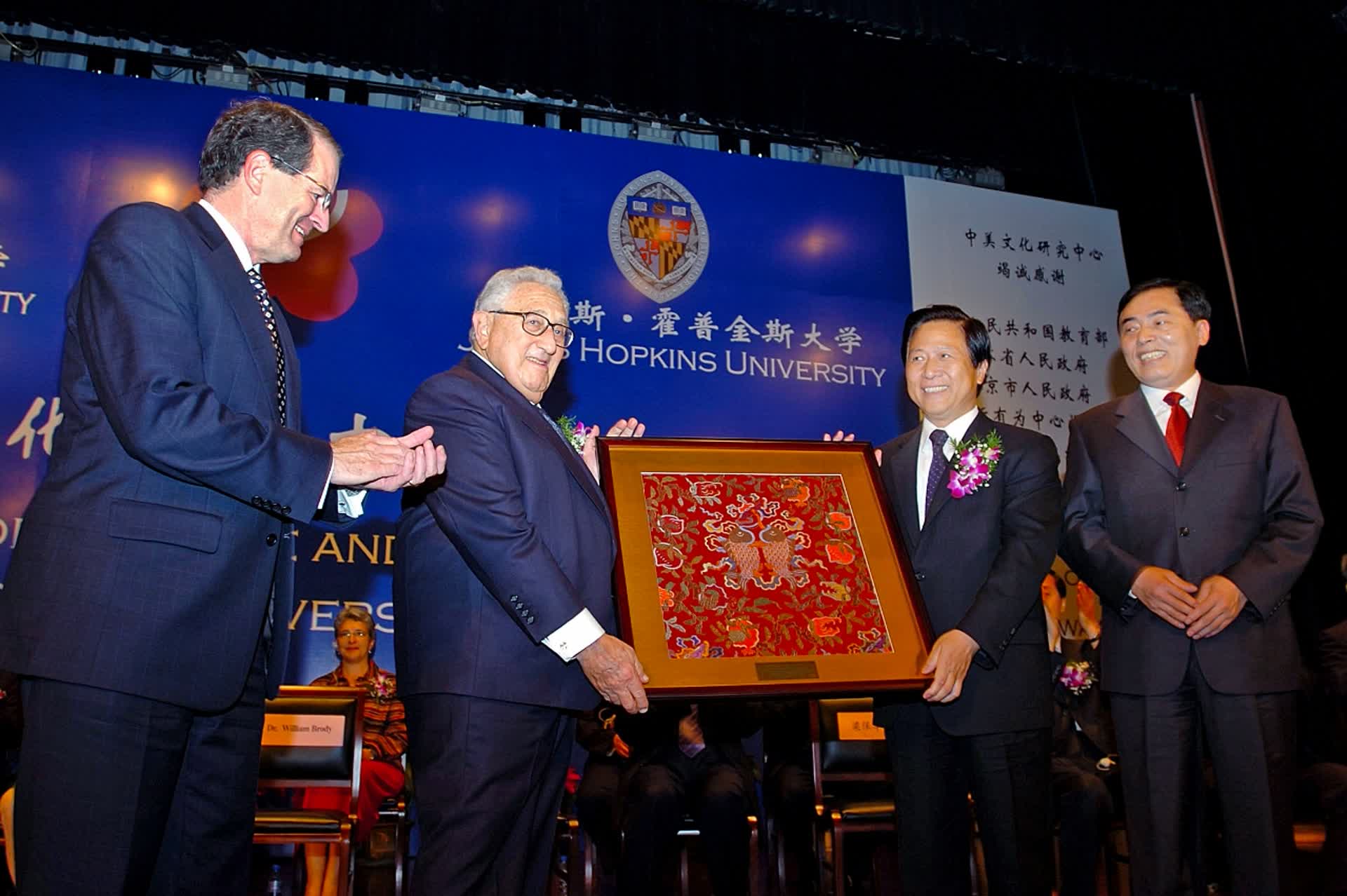 2007年6月23日,南京大学-约翰斯·霍普金斯大学中美文化研究中心举行创建20周年庆典大会。到会的中外贵宾达800多位,基辛格博士也是受邀嘉宾之一。“南大-霍大中美文化研究中心是一个增进中美交流,推动世界和平、合作与发展的非常重要的机构。”基辛格在致辞中说自己已近50次来中国,每次都是愉快的经历,都能发现新的变化,向这个伟大民族学到许多新的东西。这位时年已84岁的老人满头银发,睿智风趣,演讲从8分钟扩展到半小时,且始终条理清晰,幽默感十足,到演讲快结束时,基辛格幽默地说:“非常感谢南大、霍大给我这样一个机会来到这里。但是我也有一个忧虑,中国的这些客人到美国回访的时候,我该如何招待他们,因为中国在招待客人方面比美国人有多出几千年的经验。”