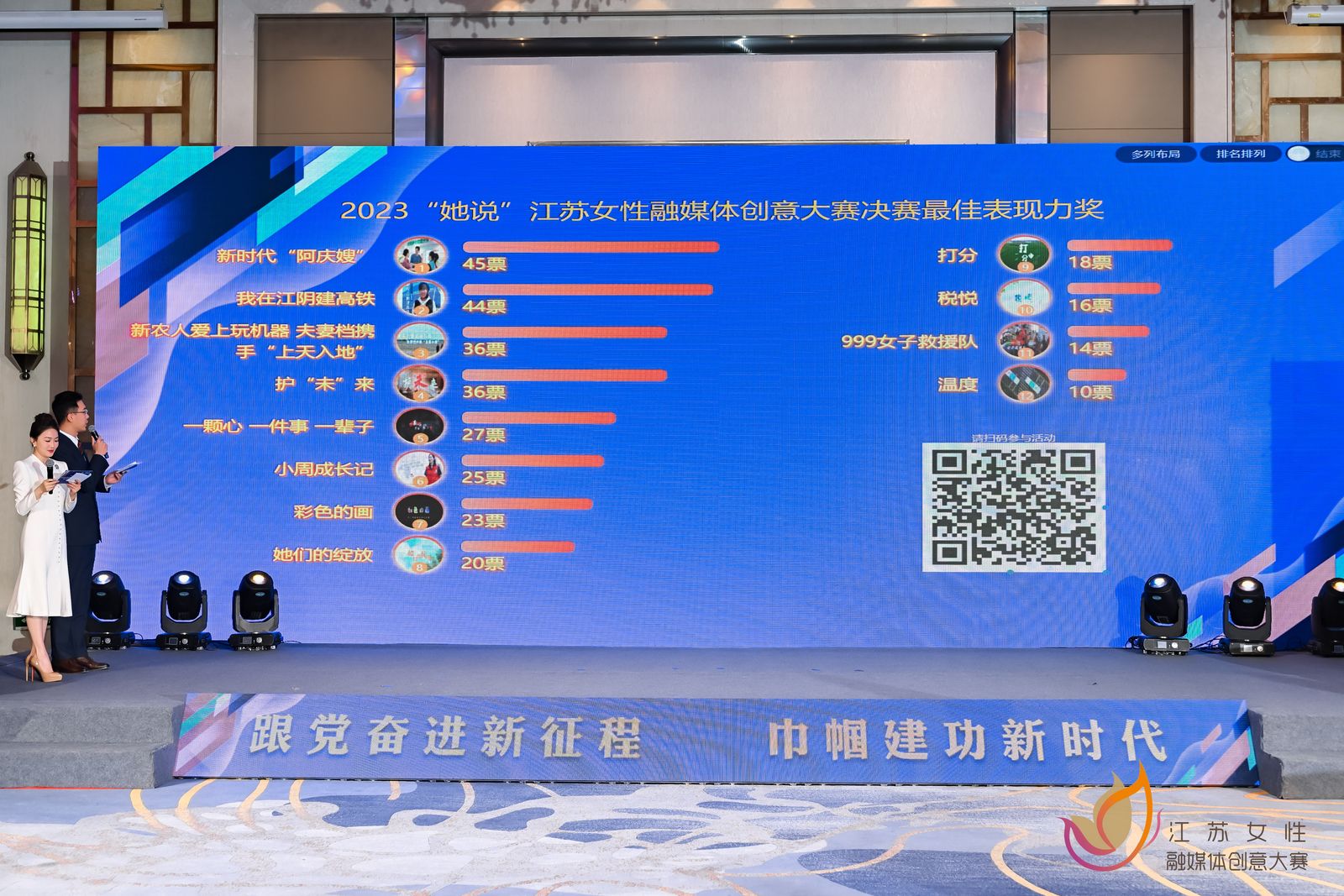 据悉,大赛共征集7591件作品,其中3000余件作品在网络等新媒体平台广为传播,点击量超千万。经过海选、评选、分赛区路演、线下训练营等赛程,12件作品脱颖而出,走上决赛路演舞台,作品主创激情路演,阐述创作理念和体会,分享创意缘起及幕后动人故事。最终,常熟市妇联选送的《新时代“阿庆嫂”》、南京市浦口区妇联选送的《新农人爱上玩机器,夫妻档携手“上天入地”》获得短视频组一等奖,张家港市妇联选送的《河阳木兰的十二时辰——致敬了不起的“她”》获得图文组一等奖,宿迁市妇联、宿迁市广播电视总台选送的《有你关心 我很幸福》获得随手拍组一等奖。