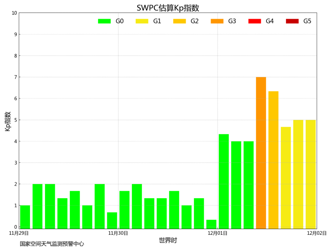 北京时间12月1日17时到12月2日8时,受太阳日冕物质抛射(CME)爆发影响,地球出现3小时Kp为7的大地磁暴,3小时Kp为6的中等地磁暴,以及9小时小地磁暴,目前地磁活动还在持续中。