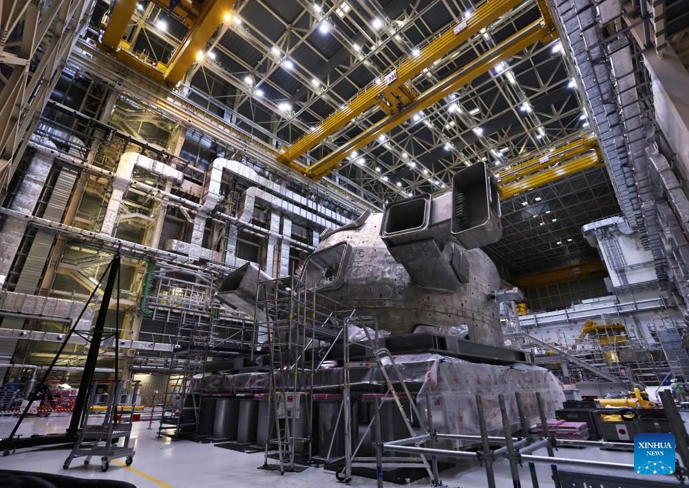 A vast device is seen at a preassembly hall of the world's largest fusion experiment machine, the ITER Tokamak, in St Paul-Lez-Durance, France, Nov. 23, 2023. (Xinhua/Gao Jing)