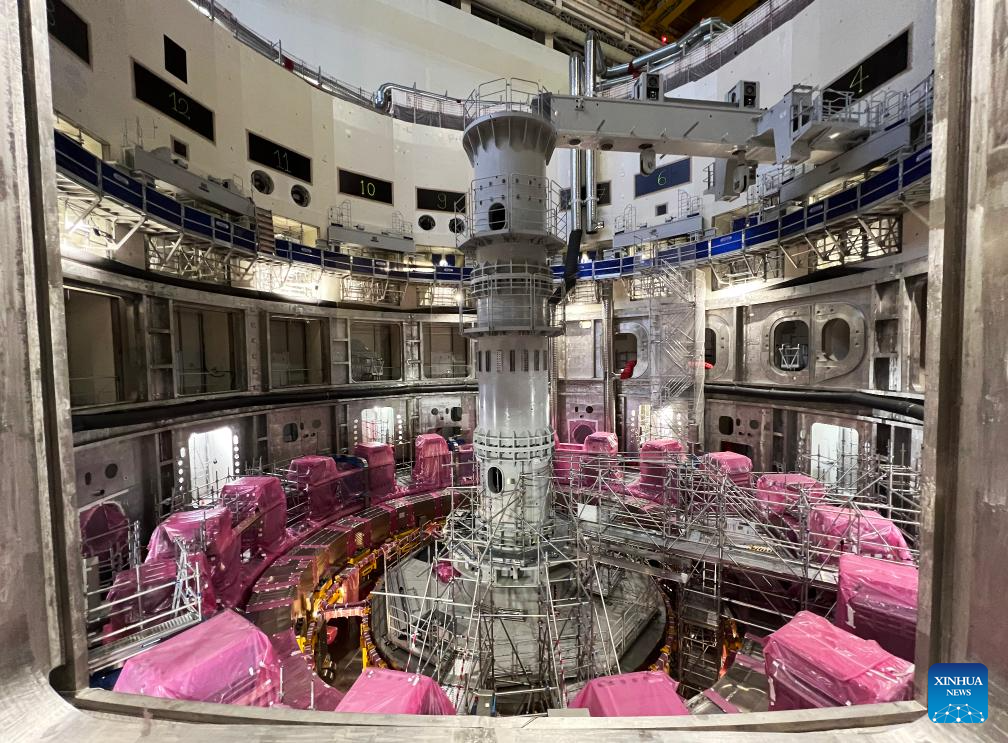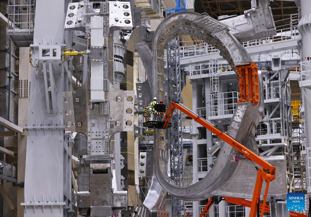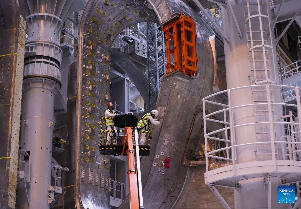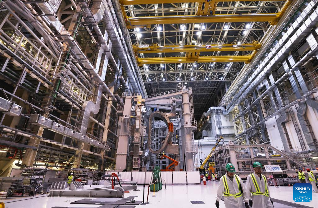 People work at a preassembly hall of the world's largest fusion experiment machine, the ITER Tokamak, in St Paul-Lez-Durance, France, Nov. 23, 2023. (Xinhua/Gao Jing)
