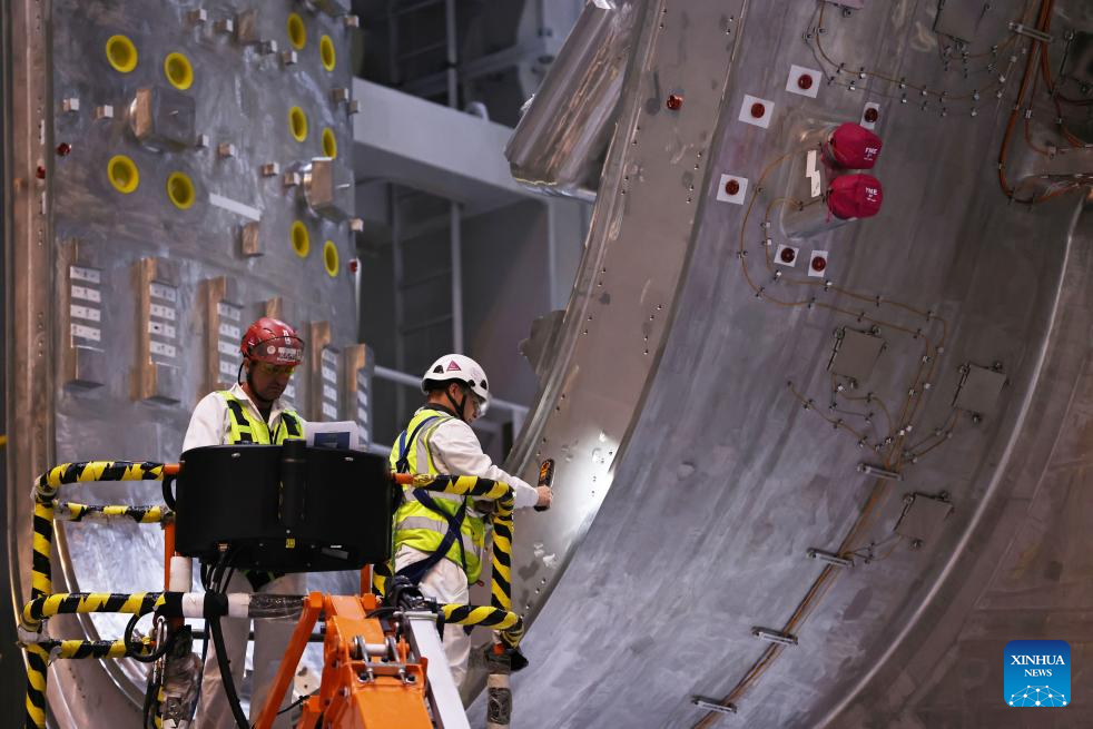 Technicians check faulty vacuum vessel sectors in the vast preassembly hall on the construction site of the ITER Tokamak in St Paul-Lez-Durance, southern France, Nov. 23, 2023. (Xinhua/Gao Jing)